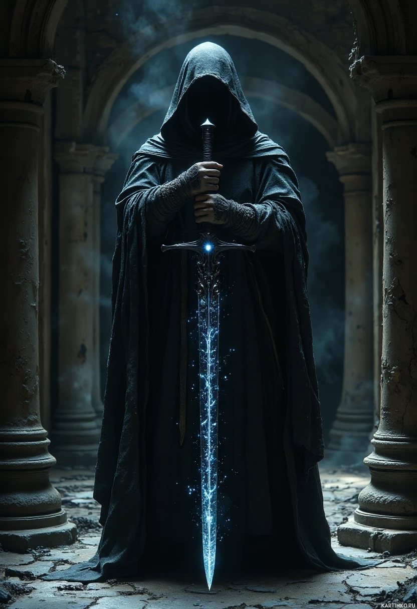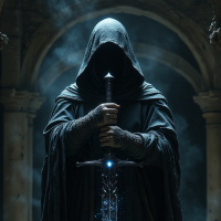 a hooded cloak that drapes over their shoulders and head, obscuring their face from view. They are holding a sword with a blue glow emanating from it, suggesting