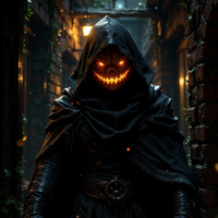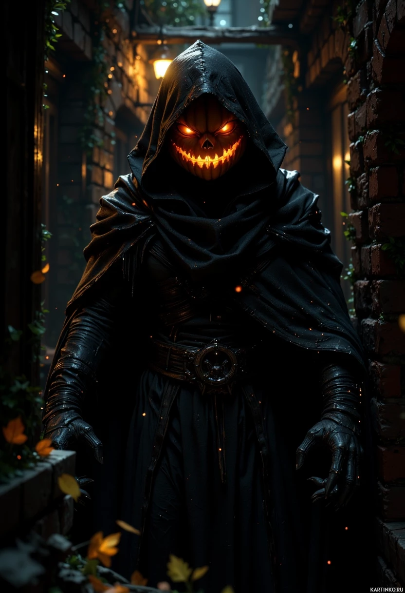 a hooded figure with a jack-o'-lantern face, set against a dark and ominous backdrop. The figure is adorned in a black robe or cloak, which appears to be made of