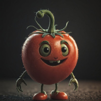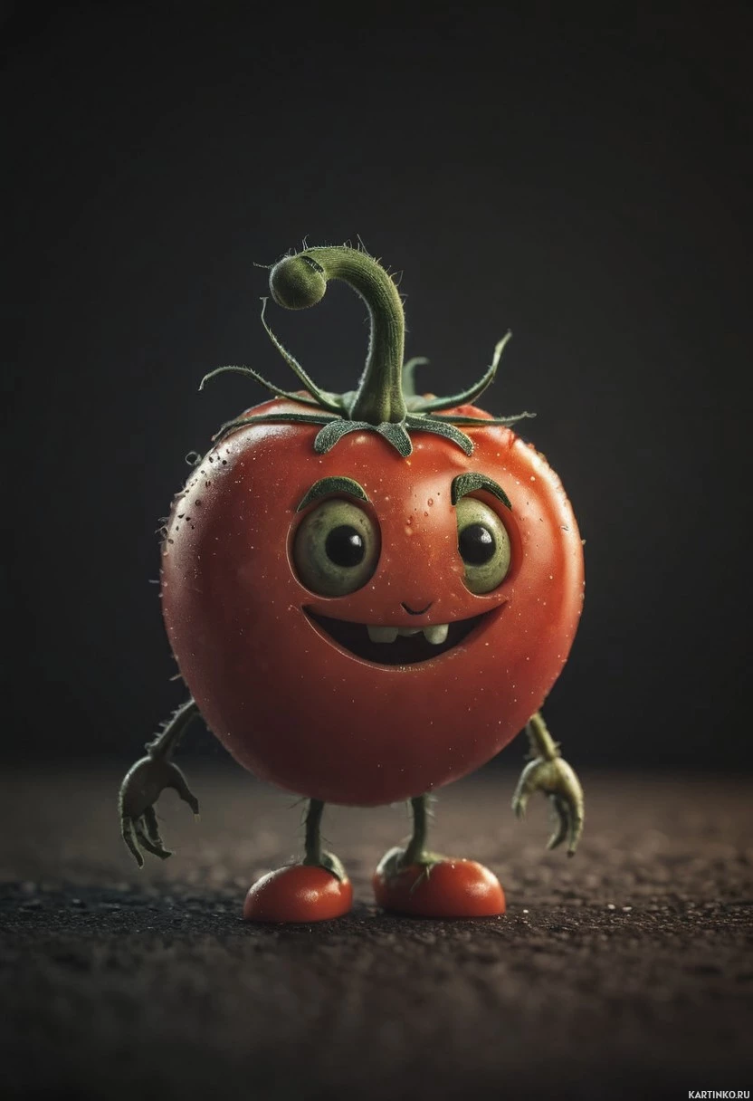 green stem protrudes from the top of the tomato's head, adding a touch of realism to its design. * The background of the image is dark and blurry, which helps to focus attention on the cartoon tomato. * The overall effect is one of whimsy and playfulness, as if the tomato has come to life in a playful and imaginative way. The cartoon tomato's endearing smile and expressive eyes make it an appealing and engaging subject. Its unique design and colorful appearance add visual interest to the image, while its standing pose gives it a sense of personality and character.