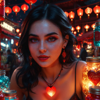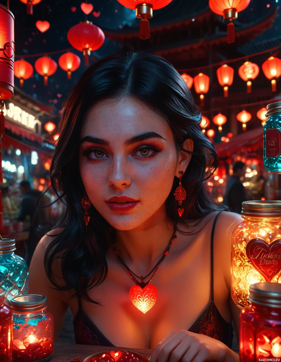 a young woman with long, dark hair and brown eyes, wearing a black spaghetti-strap top and red heart-shaped earrings. She is surrounded by various objects, including: * A large, red lantern hanging from the ceiling above her head * Several small, red lanterns scattered around the room * A few jars filled with hearts of different colors, some of which are lit up * A bowl or dish containing more hearts The overall atmosphere of the image is romantic and festive, suggesting that it may be related to Valentine's Day or another