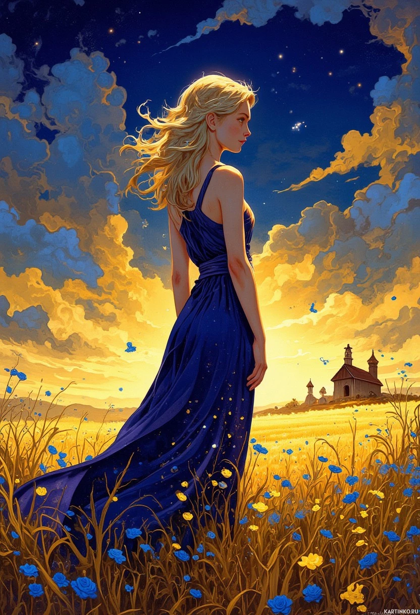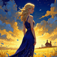 blonde hair that is blowing gently in the wind, and she is wearing a flowing blue dress with thin straps. Her back is turned to the viewer, allowing for a glimpse into her
