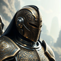 gold accents that add a touch of elegance to the overall design. The helmet, shaped like a traditional knight's helm, features an elaborate filigree pattern etched into its surface, complemented by