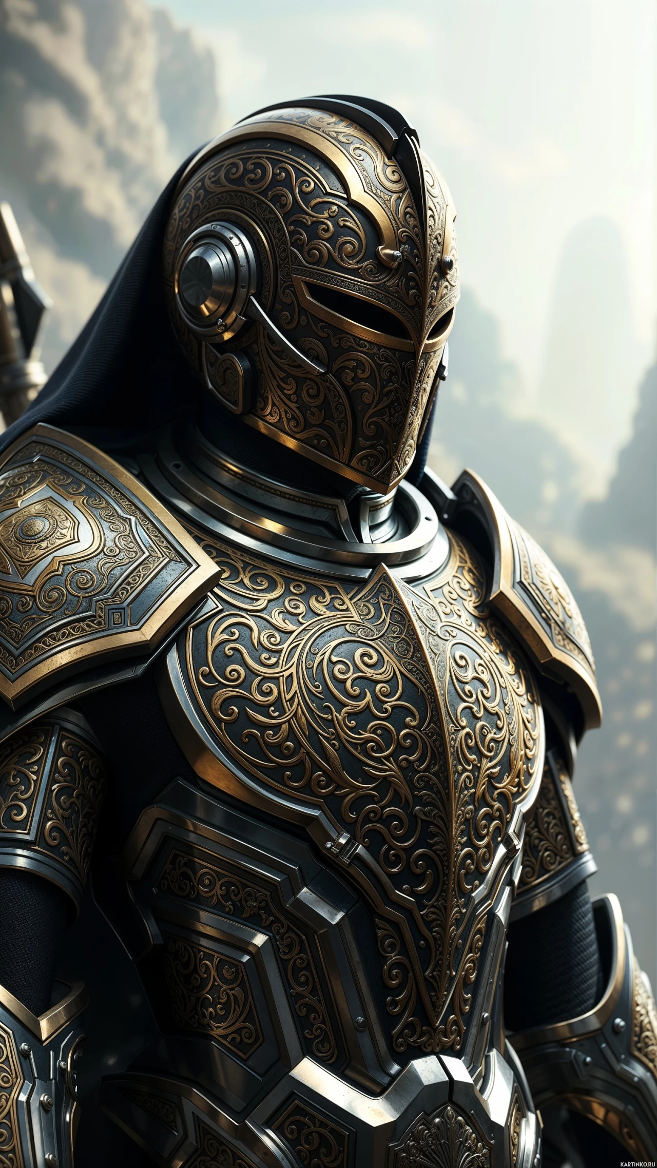 ornate armor, with a focus on intricate details and textures. The armor is predominantly black, adorned with