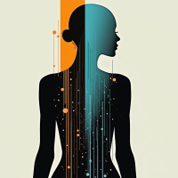 different colors, including blue, orange, and yellow, that extend from the top of the silhouette down to the bottom. + These lines are dotted with small circles or dots in matching colors. + In the background, there is a subtle gradient effect that gives the impression of depth. Overall, the image presents a striking contrast between the simple, monochromatic silhouette and the vibrant, dynamic design overlay.