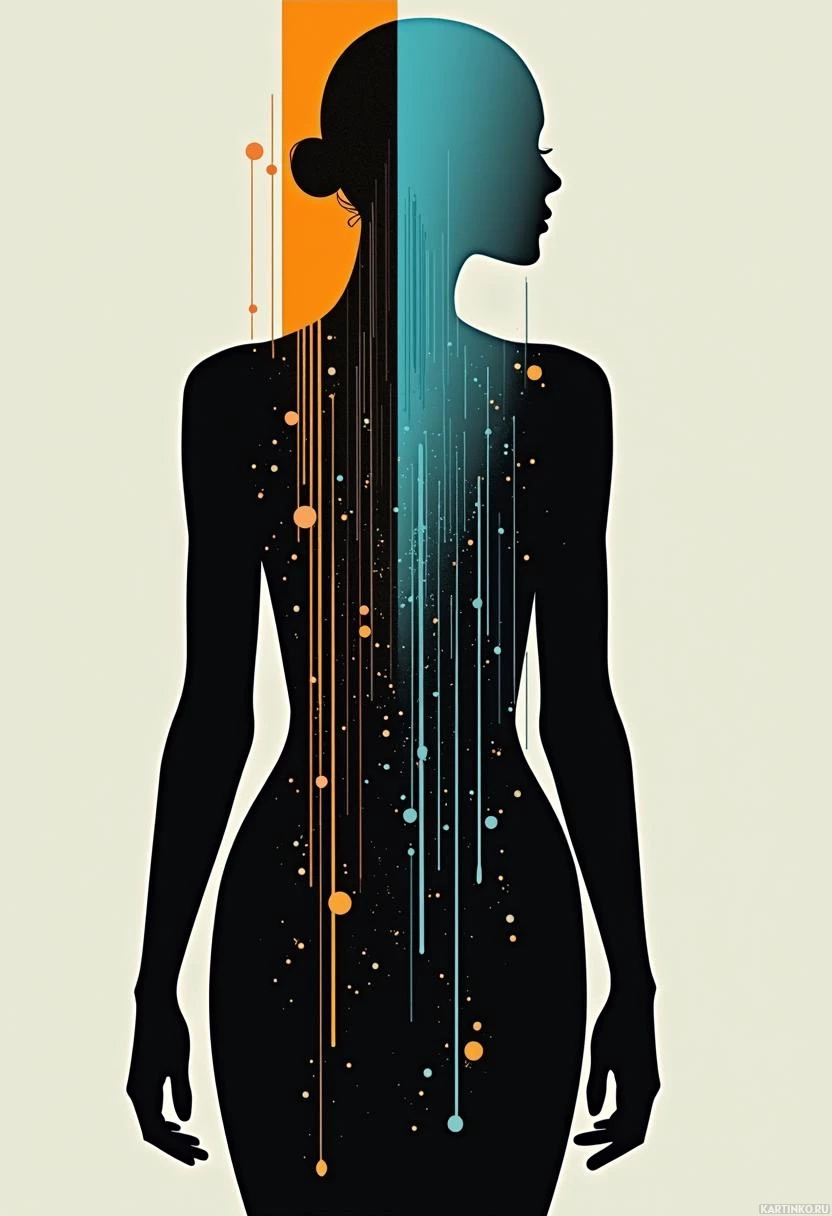 a silhouette of a woman with an abstract design superimposed over her body. * The silhouette is in black and has a smooth,