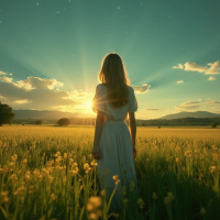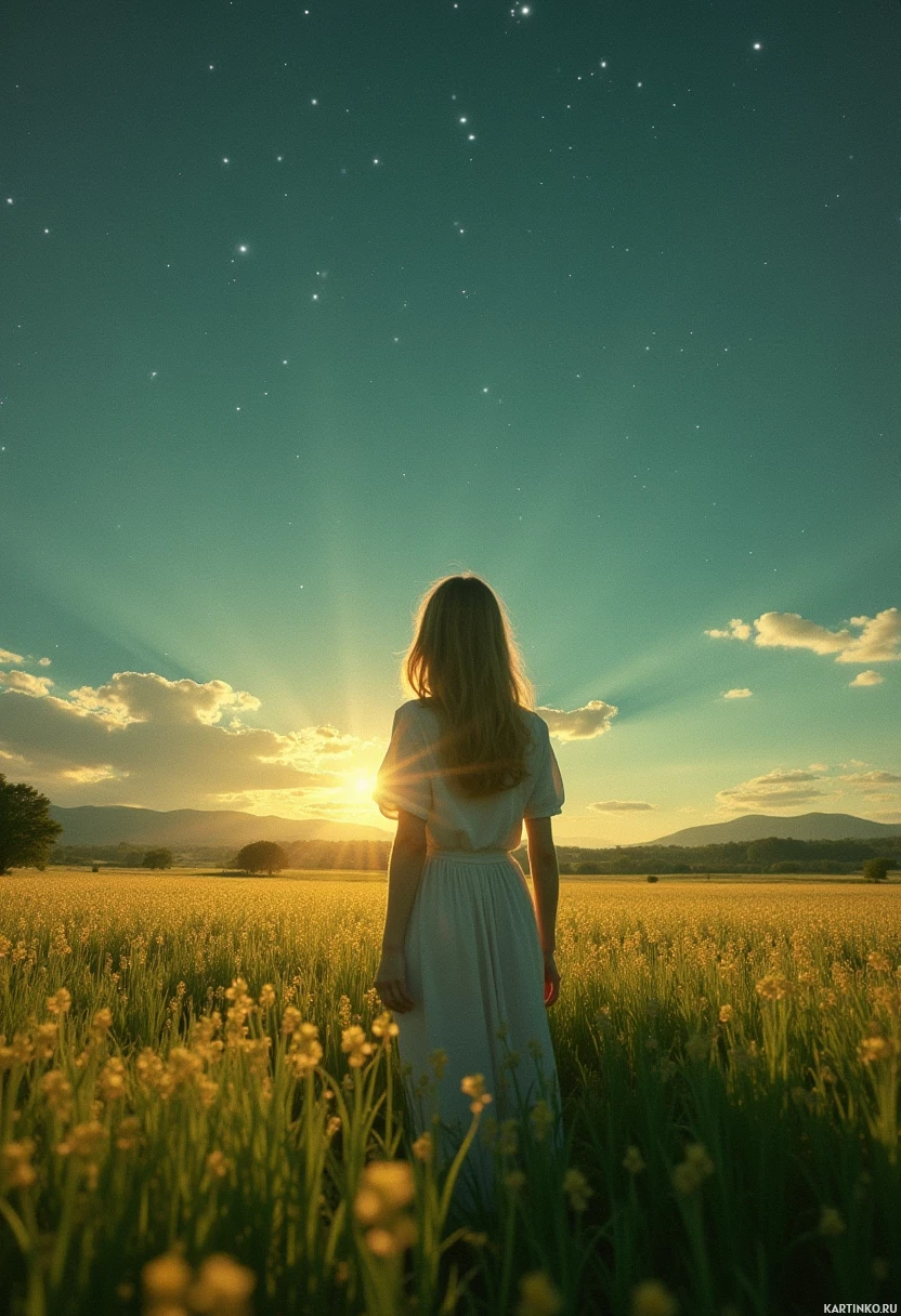 the tranquil atmosphere of the scene. The field stretches out behind her, filled with