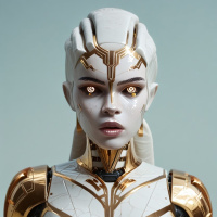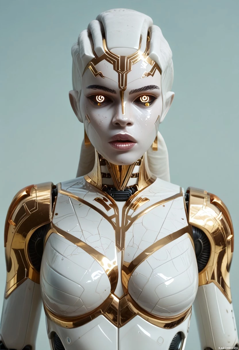 female robot with striking white and gold accents, set against a light blue background. The robot's slender build is accentuated by its shiny, metallic surface, which features a series of intricate lines and patterns that evoke a sense of