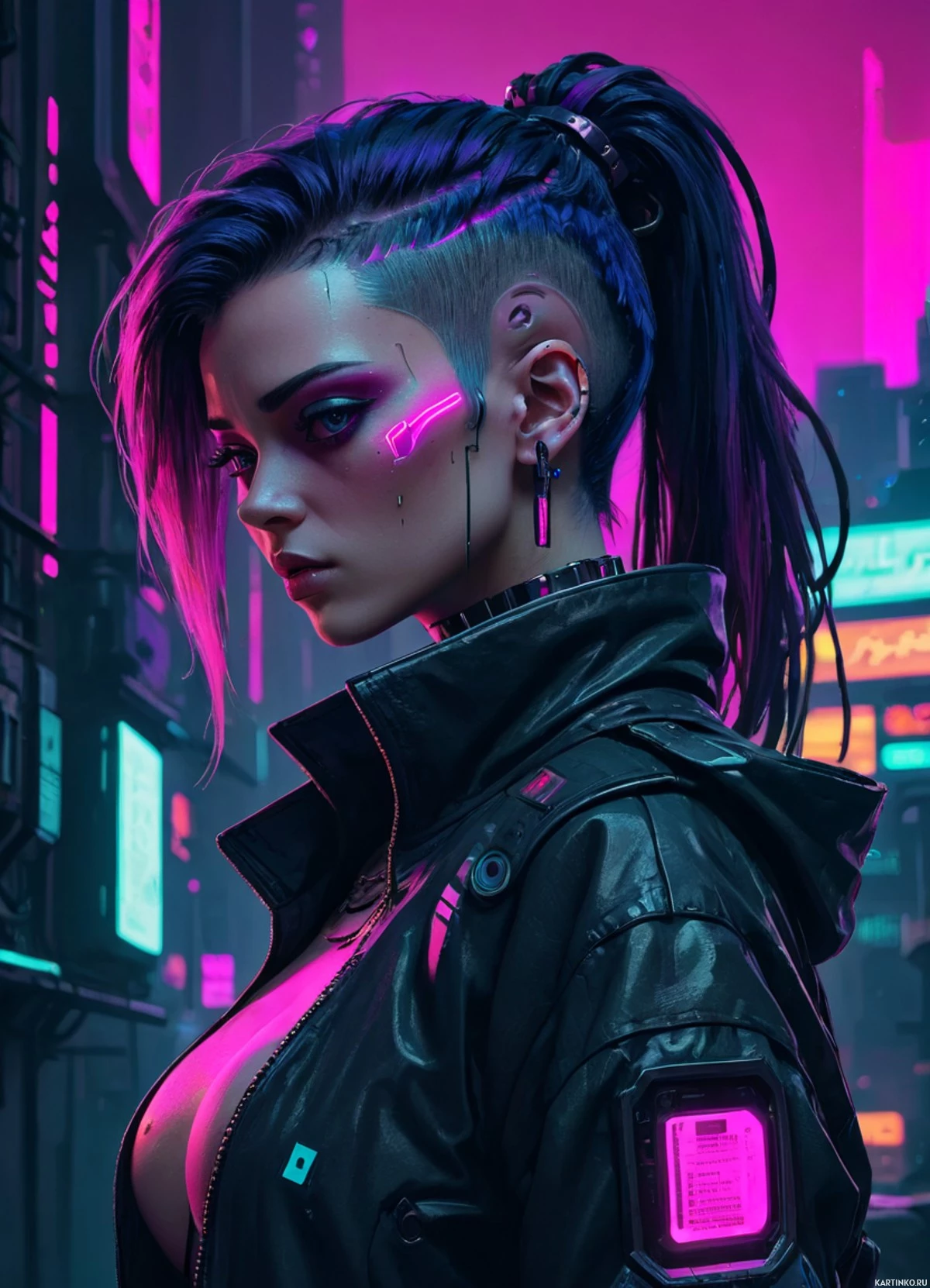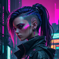 neon signs indicating shops and advertisements, which further enhances the cyberpunk atmosphere of the image.