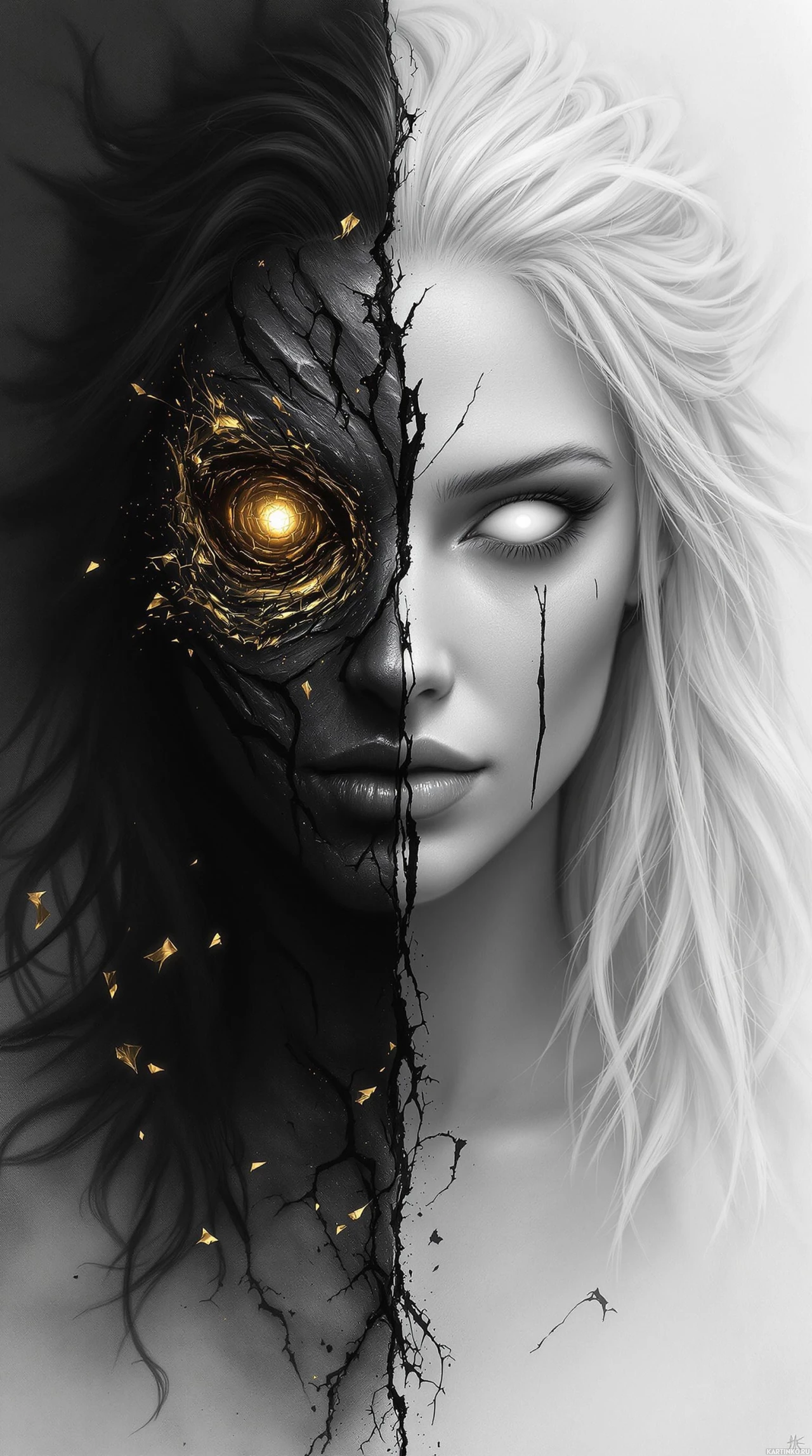 a split face, one side appearing as if it is made of dark, cracked stone and the other side appears normal. The left side of her face is black and gray with cracks running through it, while the right side is white and smooth. Her eyes are closed on both sides, but the left eye is surrounded by swirling patterns that resemble a portal or vortex. The woman's hair is long and flowing, with strands falling over her shoulders. The background of the image is not visible due to the woman's head taking up