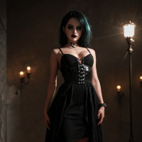blue highlights and are adorned with piercings and multiple rings on their ears. Their attire includes a black corset-style top and