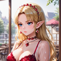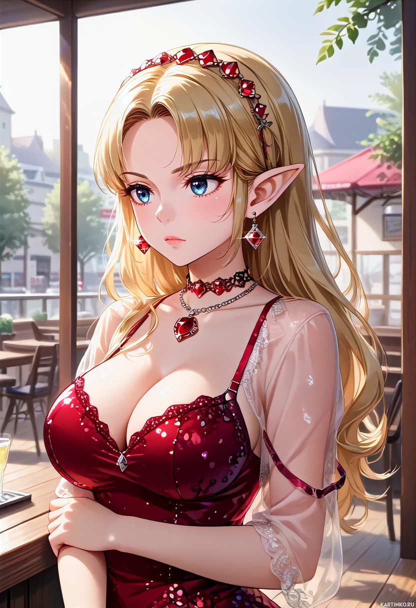 large windows, wooden tables, chairs, and greenery outside. The woman's striking features include: * Blonde hair * Elf-like ears * Large breasts She wears