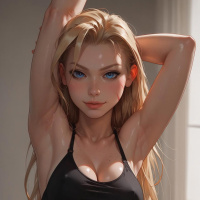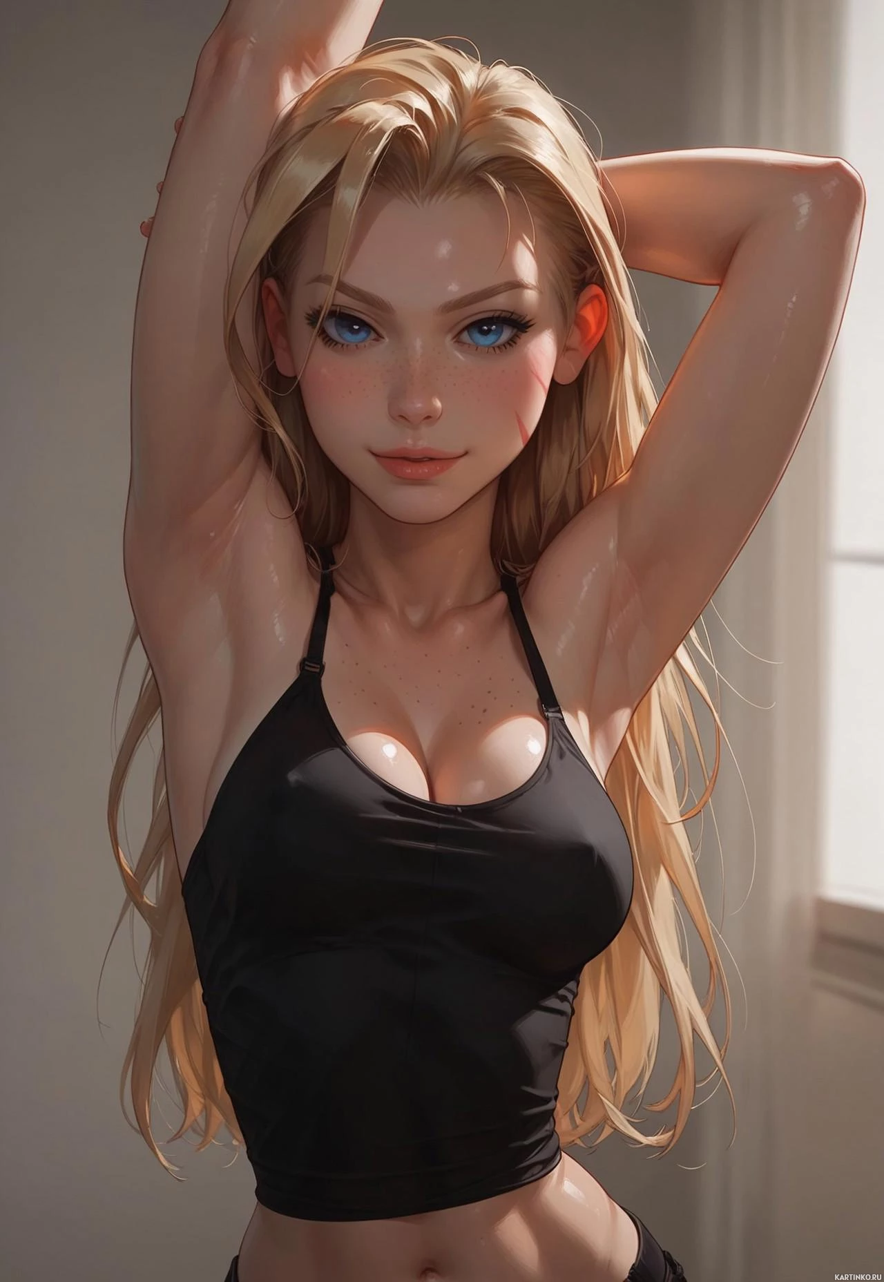 tank top that exposes her midriff. The background of the image is a plain