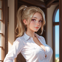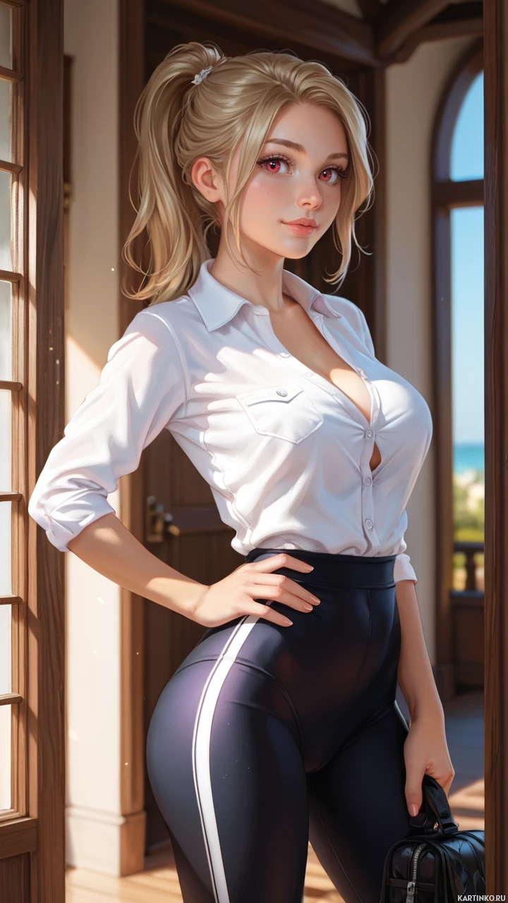 a young woman with blonde hair, wearing a white button-down shirt and black leggings with a white stripe down the side. She has her hands on her hips and is holding a black briefcase in her left hand. The background of the image appears to be an office or home setting, with a window visible behind the woman.