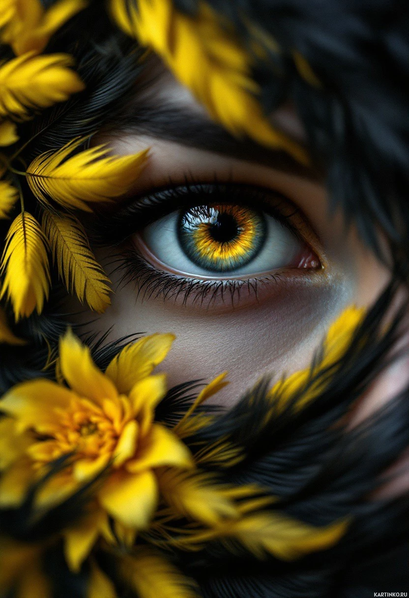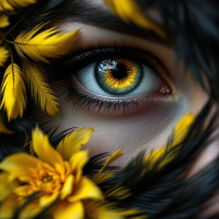 yellow flowers visible in the foreground of the image. These flowers have delicate petals that are slightly ruffled, giving them a soft and romantic appearance. They seem to be growing out of the same area as the feathers, suggesting a connection between the natural world and the human eye. Overall, the image is a beautiful representation of the intricate details found in nature, combined with the captivating beauty of the human form. The use of color, texture, and pattern creates a visually stunning effect that draws the viewer's attention and invites them to explore the image further.
