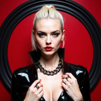 blonde hair styled in a high ponytail, wearing a black leather jacket with the zipper unzipped and her hands raised to the collar. She has red-painted fingernails and is adorned with multiple rings on each hand. She wears a large