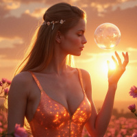 the setting sun. In her right hand, she grasps a clear bubble or crystal ball, which glows softly as if illuminated from within. The woman's eyes are closed, conveying