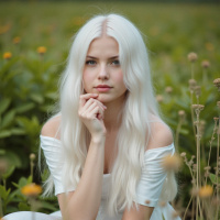 the vibrant colors of the surrounding foliage. **Background** * The field stretches out behind her, filled with an assortment of wildflowers in various shades of yellow and orange. * Tall grasses sway gently in the breeze, creating a soothing melody that complements the peaceful atmosphere. **Overall Impression** The image exudes a sense of serenity and tranquility, capturing a moment of innocence and beauty. The girl's white hair and fair skin blend seamlessly with the natural surroundings, creating a striking visual effect.