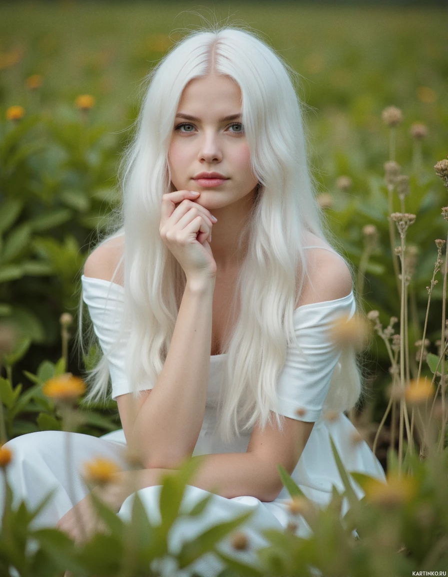 white hair, sitting in a lush field of greenery and yellow flowers. She is dressed in a flowing