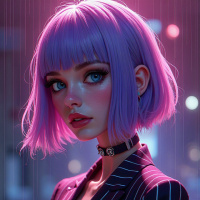 a young woman with striking purple hair, gazing over her left shoulder. Her face is turned slightly towards the viewer, showcasing her prominent cheekbones and