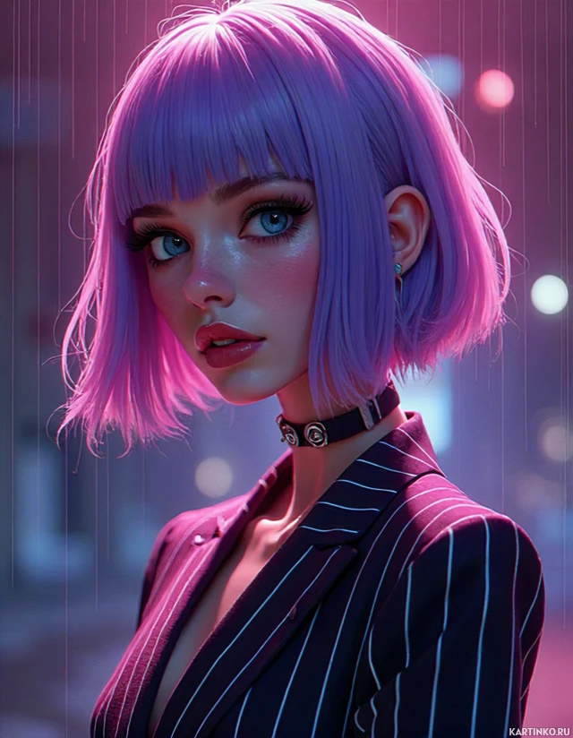 white stripes, complemented by a dark choker-style necklace featuring silver studs. In the background, raindrops are visible, adding