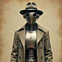 leather belt around its waist. **Background** * The background of the image is a muted tan color, which provides a subtle contrast to the robot's metallic appearance. Overall, the image presents a striking and intriguing scene, blending elements of science fiction with classic detective noir aesthetics.