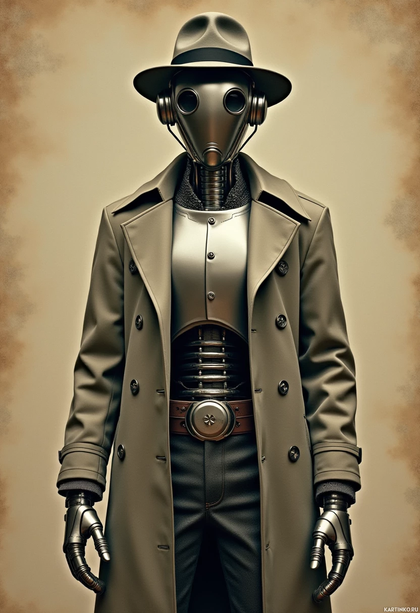a futuristic robot dressed in a trench coat and fedora, exuding an air of mystery and sophistication. **Robotic Figure** * The robot is clad in metallic attire, with a silver