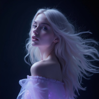loose waves, framing her face and shoulders. Her eyes are cast downward, looking at something off-camera to the left. She has a serene expression on her face, with a hint of a smile playing on her lips. In the background, there is no visible scenery or context, suggesting that the image may have been taken in a studio setting or against a plain backdrop. The overall effect of the image is one of ethereal beauty and elegance, capturing the subject's grace and poise in a single moment.