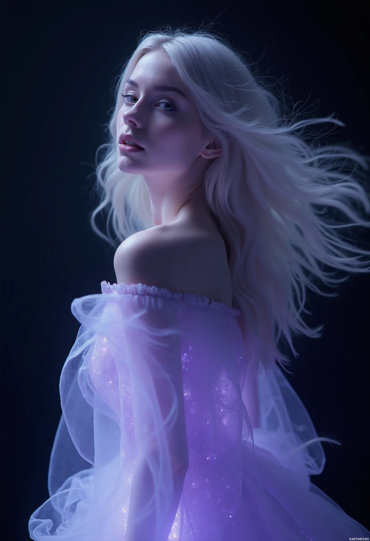 a young woman with long, flowing white hair that appears to be blowing in the wind. She is wearing a dress or skirt made of a lightweight,
