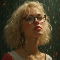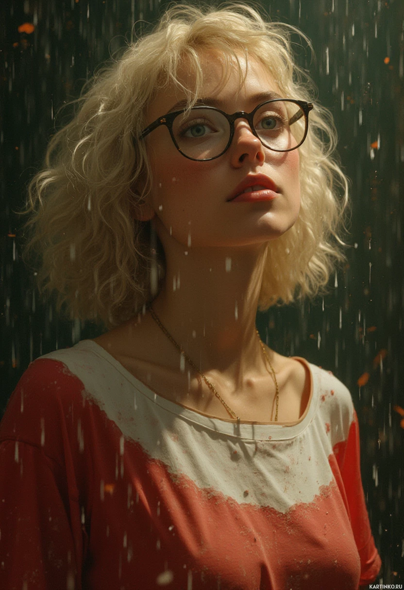 a young woman with blonde hair, wearing black-framed glasses and standing in the rain. The woman's wet hair is styled in