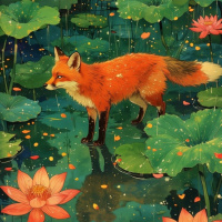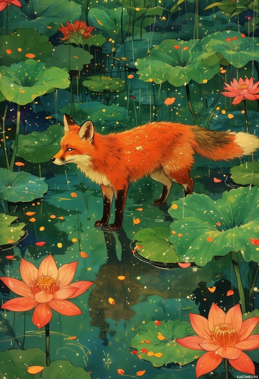 the vibrant colors of the surrounding foliage, creating a sense of depth and dimensionality in the image. Scattered throughout the pond are several large green leaves, some of which appear to be floating on the water's surface while others seem to be growing directly out of it. These leaves add to the overall sense of lushness and vitality that pervades the scene. In addition to the fox and the pond, there are also several flowers visible in the image. Some of these flowers appear to be blooming directly from the water's edge, while others seem to be growing on nearby plants or trees. The flowers come in a variety of colors, including pink, yellow, orange, and white, adding to the overall visual interest and beauty of the scene. Overall, this image presents a peaceful and idyllic atmosphere, evoking feelings of serenity and connection with nature.