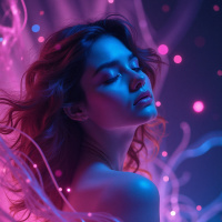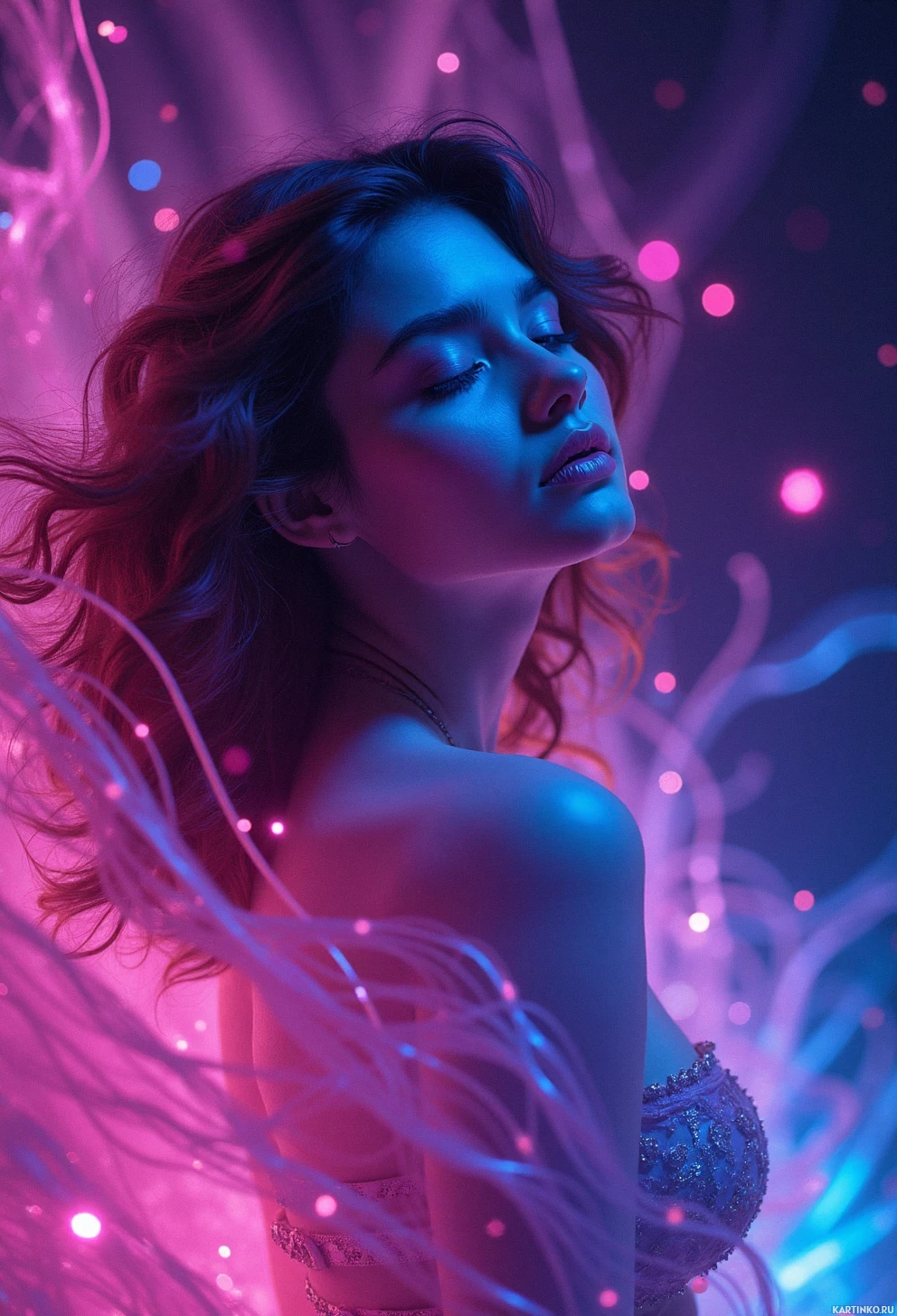 white dress or robe, its fabric billowing gently around her slender figure as if caught in an invisible breeze. The dress features intricate embroidery or beading along the neckline and hem, adding a touch of elegance to the overall composition. In the foreground, strands of neon pink and blue lights weave through the woman's hair, creating a mesmerizing pattern that draws the viewer's eye upwards towards the top-left corner. These lights appear to emanate from an unseen source above, casting a soft, ethereal glow over the entire scene. The background of the image is dark and featureless, with no discernible objects or details visible beyond the subject. This minimalist approach serves to focus attention squarely on the woman herself, allowing her tranquil demeanor and radiant beauty to take center stage. Overall, this captivating image presents a dreamlike portrait of a young woman basking in the gentle radiance of neon lights, exuding an aura of serenity and enchantment that invites the viewer to step into her peaceful world.