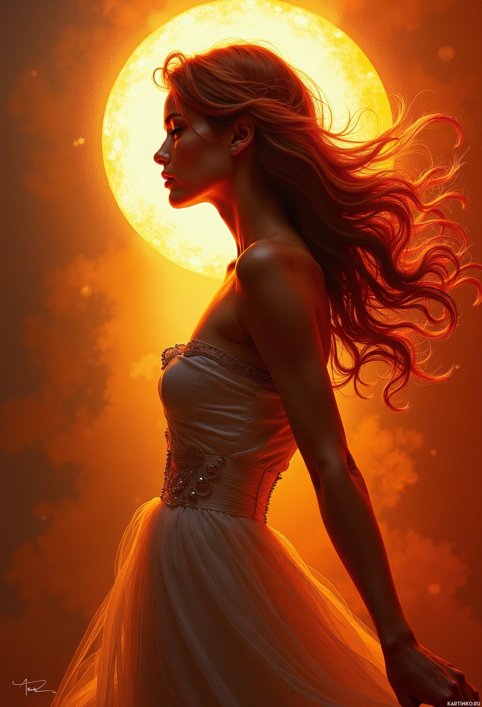 a young woman with long, red hair that flows behind her like a river of fire. Her eyes are closed, and she is dressed in a flowing