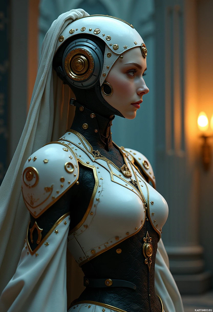 a futuristic outfit, exuding an air of mystique and otherworldliness. Her attire is a fusion of ancient and modern elements, with intricate patterns and symbols etched into her clothing, evoking the essence of