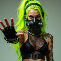 a sense of confidence and assertiveness. The overall aesthetic of the image exudes a post-apocalyptic or dystopian theme, with the neon green hair and accents creating a bold and eye-catching contrast against the darker tones of the outfit and background.