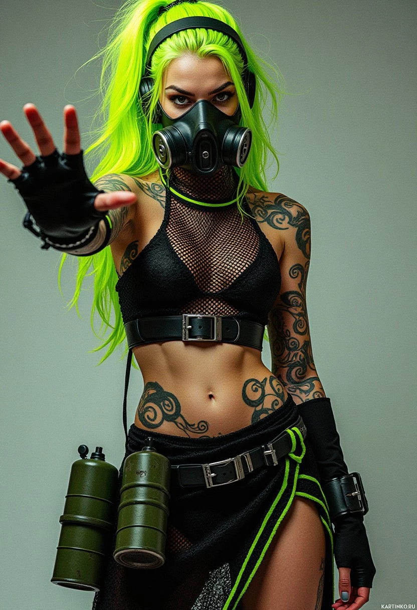 a respirator mask covering her nose and mouth, complemented by fingerless gloves on her hands. Her body is adorned with numerous tattoos, adding