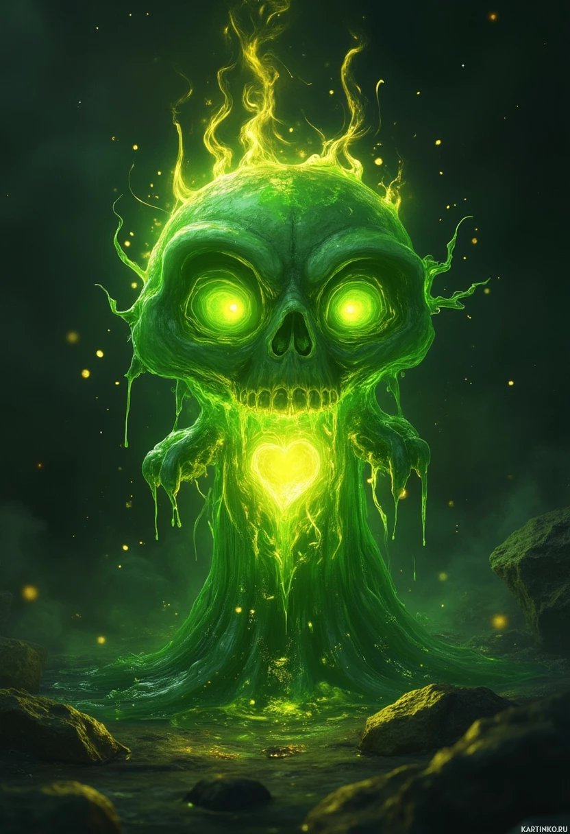 The image depicts a skull that has been transformed into a monster, with green slime covering its surface and glowing