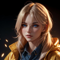 The image shows a stylized female character, who is a girl with blonde hair. She has blue eyes and wears a yellow raincoat. Her gaze is directed off to the side and she seems to have a serious expression.