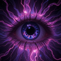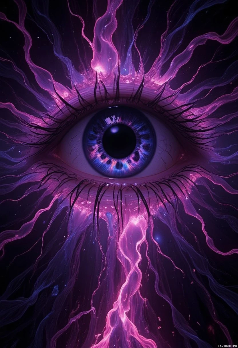 The image depicts a close-up of an eye, with vibrant purple and pink tendrils emanating from it. The eye is centered in the frame, with the eyelashes visible at the bottom. The iris is blue, surrounded by a ring of light-colored skin. The pupil is dark and circular, while the sclera is white. The purple and pink tendrils appear to be made up of thin,