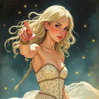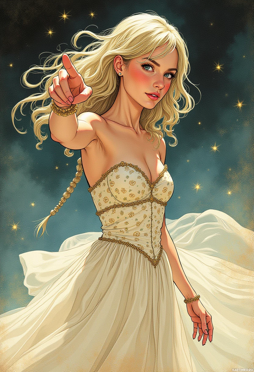 pink hue, complementing the overall softness of her features. In the background of the image, stars twinkle like diamonds against a dark blue sky, creating a sense of depth and atmosphere. The woman's pose suggests she is dancing or twirling in the night air, with her dress flowing around her as if caught up in an ethereal breeze. Overall, the image exudes a sense of whimsy and romance, evoking feelings of wonder and enchantment.