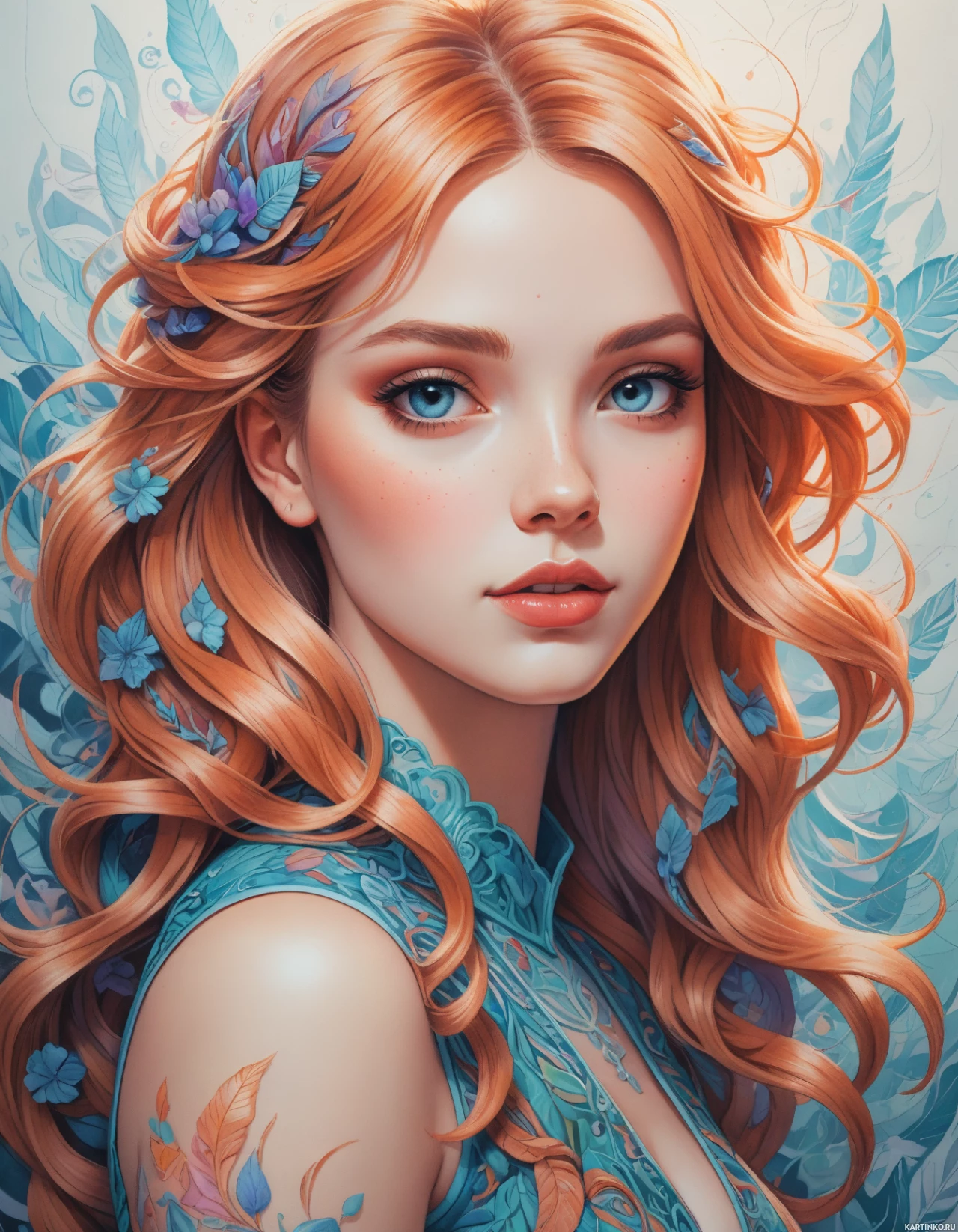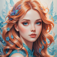 an inner light, as if reflecting the beauty of the world around her. Her eyebrows are thin and arched, adding to the overall impression of elegance and poise. The woman's lips are full and plump, painted a deep red that complements her fiery locks perfectly. They curve upwards in a subtle smile, suggesting a sense of confidence and self-assurance. Her nose is straight and proportional to the rest of her face, giving her an air of classic beauty. The background of the image is a soft, muted color that allows the subject to take center stage. It's impossible to discern any specific details or objects in the background, as they are completely overshadowed by the woman's striking features. Overall, the image presents a stunning portrait of a young woman with an otherworldly beauty that seems almost ethereal.
