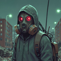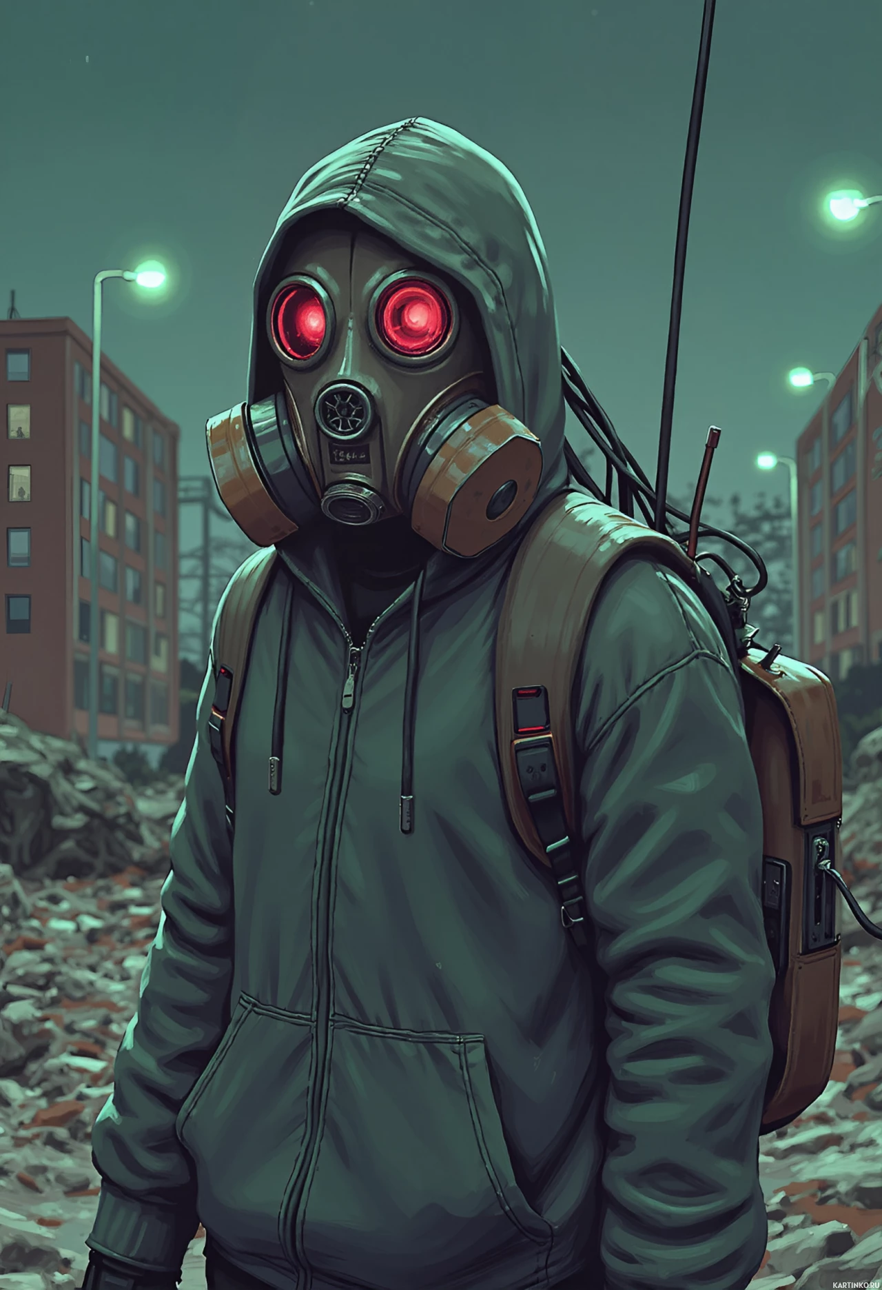 several objects protruding from the top of the backpack, possibly tools or equipment. * **Respirator Mask:** * The mask covers the person's nose and mouth, with two red glowing eyes visible through the filter material. * It has a hose attached to it, which appears to be connected to an air tank on the person's back. * The mask is made of a thick, rubbery material and has a metallic frame. Overall, the image suggests that the person is preparing for a hazardous environment or situation, possibly a chemical attack or a disaster scenario. The respirator mask and backpack suggest that they are equipped with protective gear and supplies to survive in such an environment.
