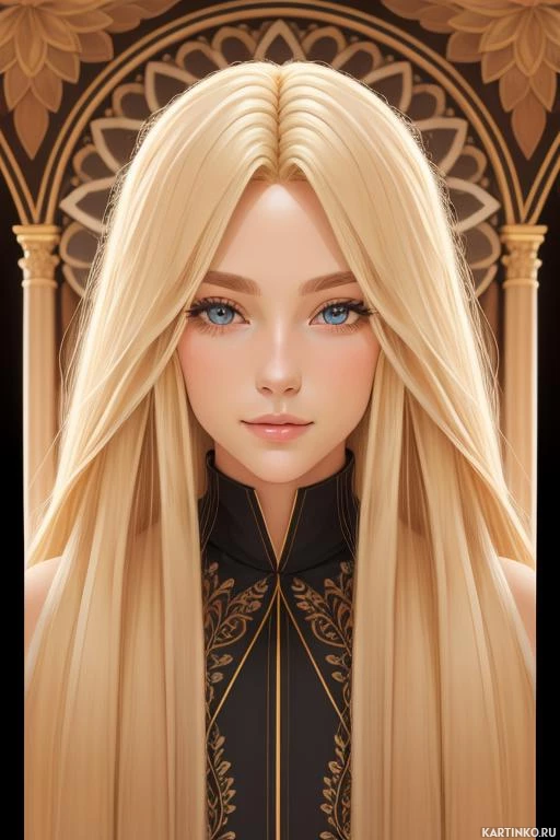 pale skin and blonde hair, which further highlights her features. The overall composition of the image is balanced, with the character centrally placed within a frame that resembles a traditional golden picture or painting, enhancing the regal and otherworldly quality of the artwork.