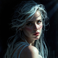 a young woman with long, flowing white hair that cascades down her back like a river of silk. Her eyes are an icy blue, and her skin is fair and smooth, giving her an ethereal appearance. She wears a simple yet elegant dress made of