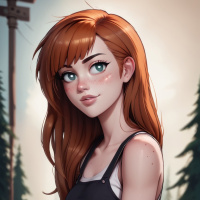 a young woman with long, flowing red hair and striking blue eyes. She has