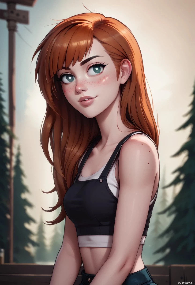 fair skin and is dressed in a black tank top layered over a white shirt, paired with dark green pants or shorts. Her gaze is directed to the left side of the image, suggesting she may be looking at something outside the frame. In the background, there are blurred trees visible behind her, creating