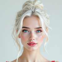 blonde hair styled into a messy bun at the top of her head, while loose strands frame her face and fall down her neck. The woman's makeup accentuates her features, with subtle blush on her cheeks and light