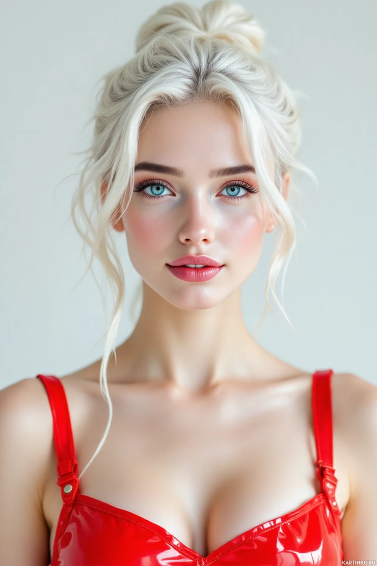 the focal point of the image, with their striking blue color drawing attention to the subject's gaze. Her eyebrows are neatly shaped and filled in, adding definition to her facial structure. The woman's attire consists of a red top or dress, which adds a pop of color to the otherwise neutral background. Overall, the image presents a captivating portrait that showcases the subject's unique features and style, making it an engaging and memorable visual experience.