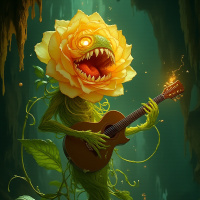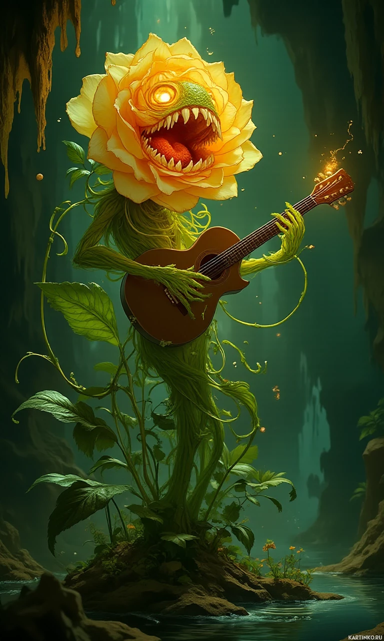 sharp teeth, while its body appears to be made up of vines or branches. Its arms are long and slender, resembling the stems of plants, but with fingers similar to those of animals. It holds a guitar in one hand, which seems to be emitting