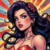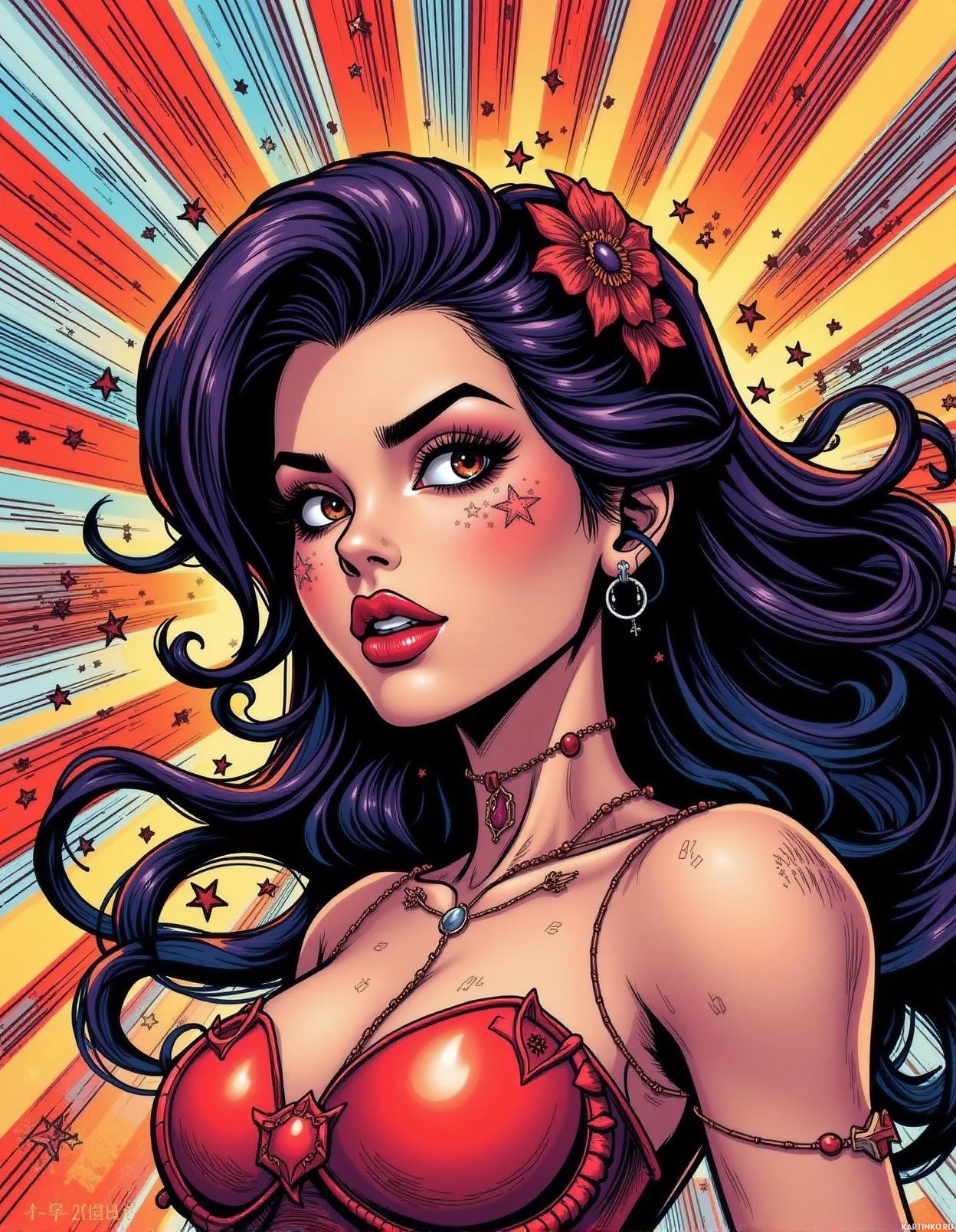 a red bra with underwire cups and a halter-style strap that goes around the back of her neck. * The bra has a decorative trim along the edges of the cups and straps. * **Accessories:** * The woman is wearing hoop earrings with small, round charms dangling from them. * She also wears two necklaces: one featuring a star pendant and another with a chain and a small, red gemstone. * Her left wrist appears to be adorned with a thin bracelet or anklet. * **Overall Appearance:** * The woman's overall appearance is that of a confident and playful young adult. * She seems to be posing for the camera, showcasing her features and accessories. * The illustration style gives the image a cartoonish feel, with bold lines and bright colors used throughout.