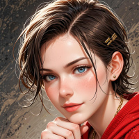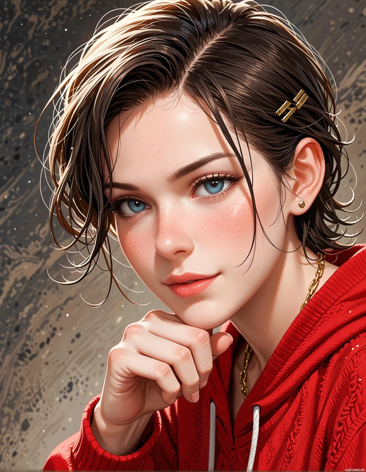 an expression of curiosity or contemplation. Her gaze is captivating, drawing the viewer in with its intensity. The background of the image features a mottled gray-brown pattern, reminiscent of marbled paper or stone. The overall effect is one of